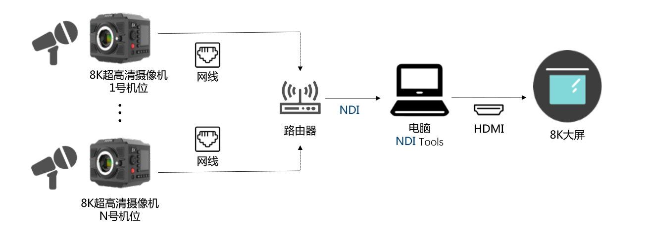 应用场景:视频会议(政府/重要单位/企业) 特点:单个高清摄像机拍摄精细物体或活动,并近距离直播展示 设备:8K摄像机G1及镜头;HDMI2.1线;高清大屏;三角架、电源、兔笼等配件